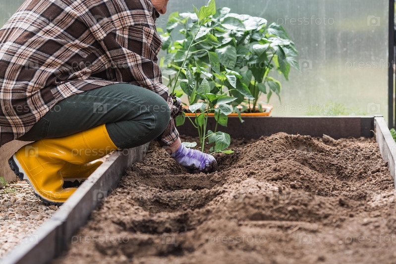 Пожилая женщина в садовых перчатках сажает молодое растение в землю. Семена колокольного перца высаживают в землю. Концепция весенней посадки овощей и сельского хозяйства