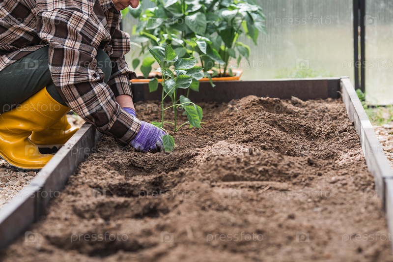Пожилая женщина в садовых перчатках сажает молодое растение в землю. Семена колокольного перца высаживают в землю. Концепция весенней посадки овощей и сельского хозяйства