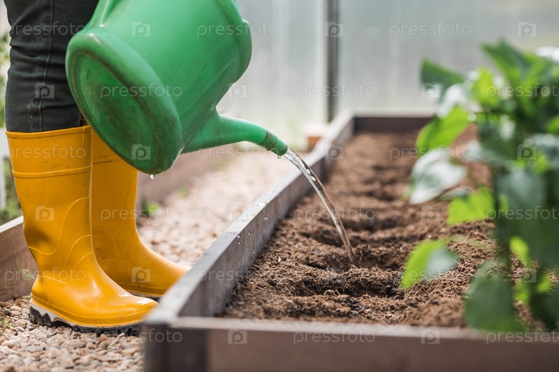 Пожилая женщина с поливом может поливать землю перед посадкой растения. Семена высаживают в землю в теплице. Концепция весенней посадки овощей и сельского хозяйства