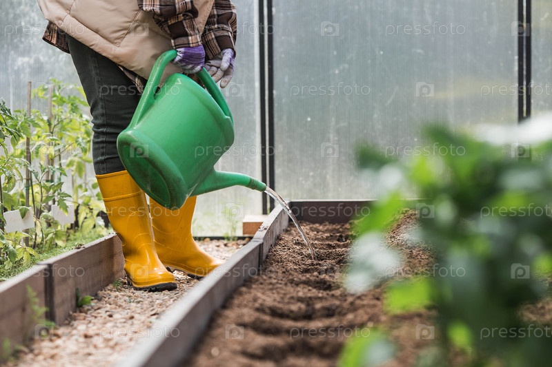 Пожилая женщина с поливом может поливать землю перед посадкой растения. Семена высаживают в землю в теплице. Концепция весенней посадки овощей и сельского хозяйства