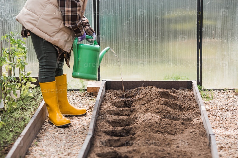 Пожилая женщина с поливом может поливать землю перед посадкой растения. Семена высаживают в землю в теплице. Концепция весенней посадки овощей и сельского хозяйства
