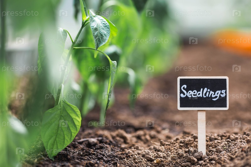 Знак с надписью на русском языке: «перец». Сеянцы колокольного перца высаживают в землю в теплице. Концепция весенней посадки овощей и земледелия