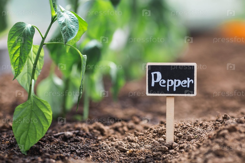 Знак с надписью на русском языке: «перец». Сеянцы колокольного перца высаживают в землю в теплице. Концепция весенней посадки овощей и земледелия