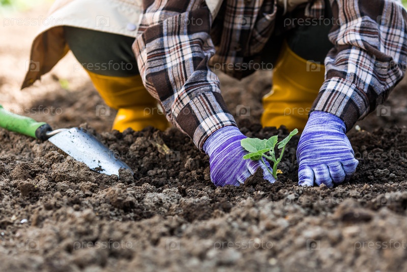 Руки женщины в садовых перчатках держат молодое растение в земле. Тыквенные и кабачковые саженцы высаживают в грунт. Концепция весенней посадки овощей и сельского хозяйства