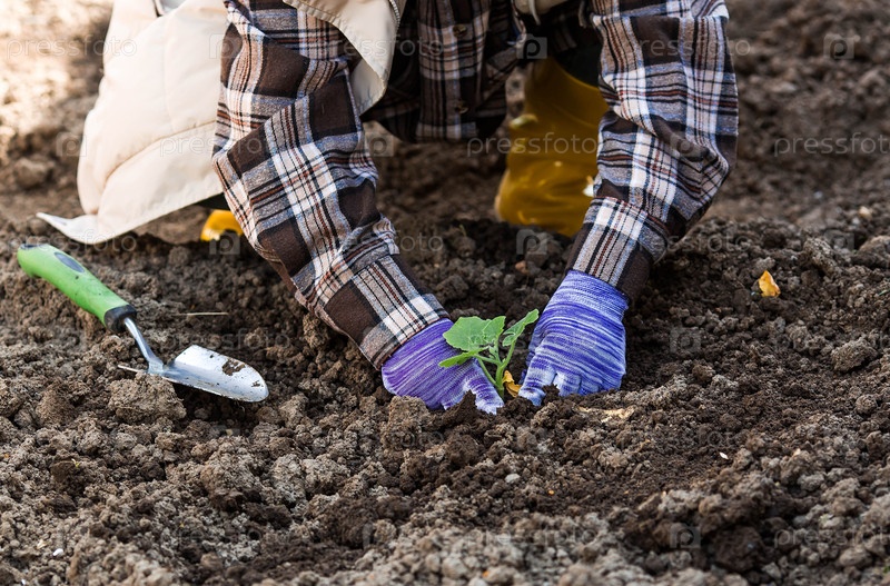 Руки женщины в садовых перчатках держат молодое растение в земле. Тыквенные и кабачковые саженцы высаживают в грунт. Концепция весенней посадки овощей и сельского хозяйства