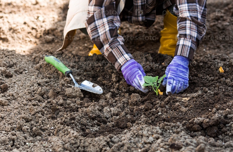 Руки женщины в садовых перчатках держат молодое растение в земле. Тыквенные и кабачковые саженцы высаживают в грунт. Концепция весенней посадки овощей и сельского хозяйства