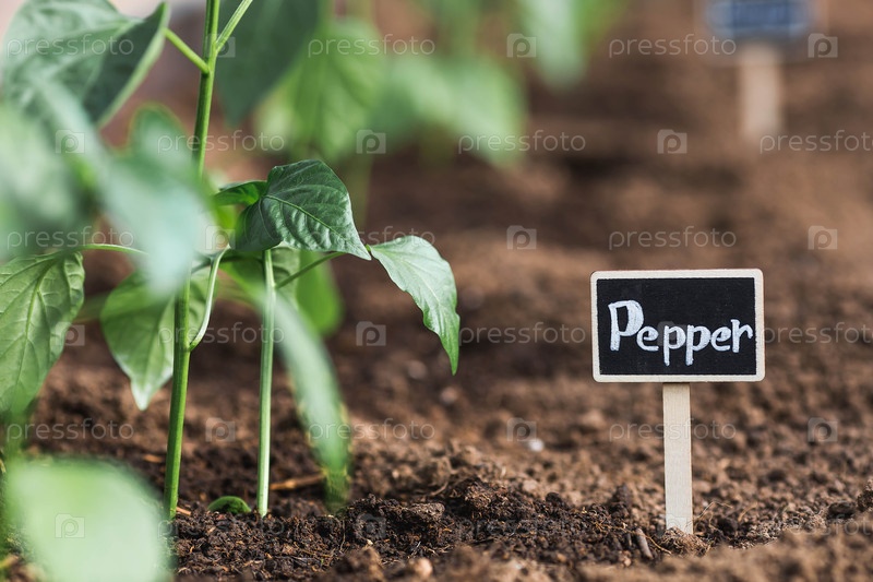 Знак с надписью Перец. Сеянцы колокольного перца высаживают в землю в теплице. Концепция весенней посадки овощей и земледелия