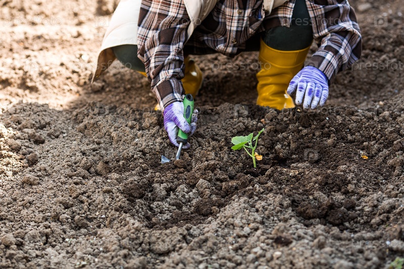 Руки женщины в садовых перчатках держат молодое растение в земле. Тыквенные и кабачковые саженцы высаживают в грунт. Концепция весенней посадки овощей и сельского хозяйства
