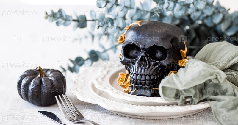 Таинственный черный череп с золотыми розами и тыквами на тарелках для Хэллоуина или Дня мертвых