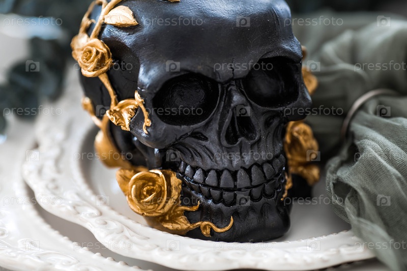 Таинственный черный череп с золотыми розами и тыквами на тарелках для Хэллоуина или Дня мертвых