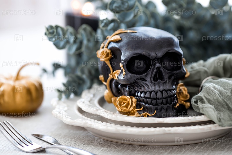 Таинственный черный череп с золотыми розами и тыквами на тарелках для Хэллоуина или Дня мертвых