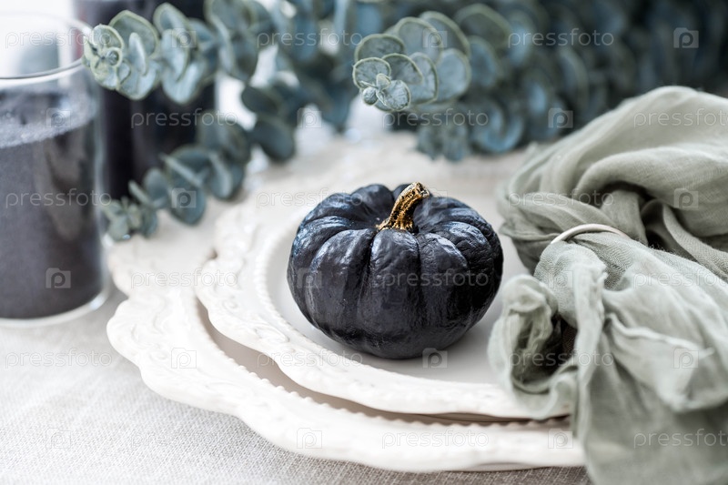 Черная тыква на подаче тарелок на стол на Хэллоуин или День мертвых