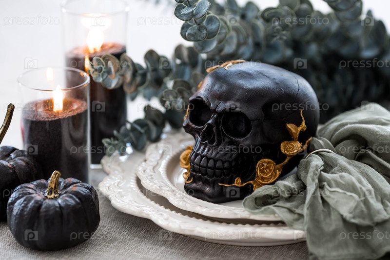 Таинственный черный череп с золотыми розами и тыквами на тарелках для Хэллоуина или Дня мертвых