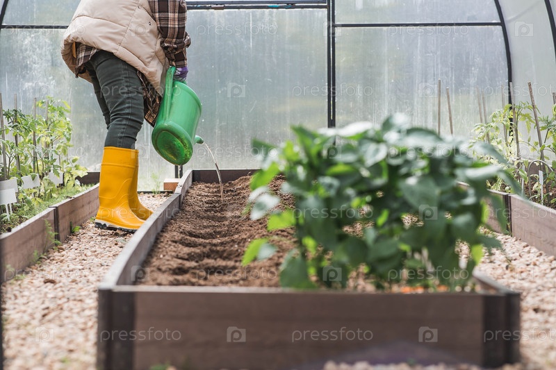 Пожилая женщина с поливом может поливать землю перед посадкой растения. Семена высаживают в землю в теплице. Концепция весенней посадки овощей и сельского хозяйства