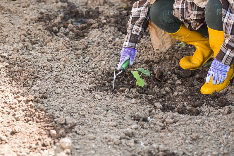 Руки женщины в садовых перчатках держат молодое растение в земле. Тыквенные и кабачковые саженцы высаживают в грунт. Концепция весенней посадки овощей и сельского хозяйства