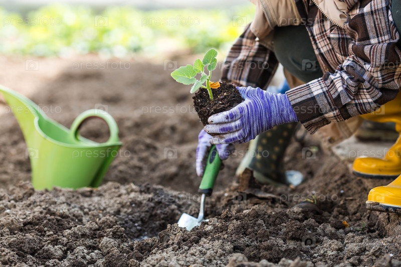 Руки женщины в садовых перчатках держат молодое растение в земле. Тыквенные и кабачковые саженцы высаживают в грунт. Концепция весенней посадки овощей и сельского хозяйства