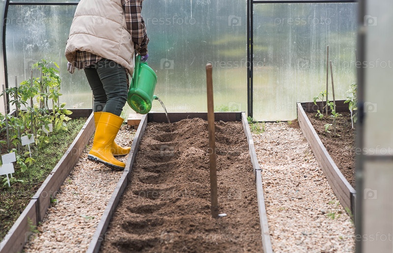 Пожилая женщина с поливом может поливать землю перед посадкой растения. Семена высаживают в землю в теплице. Концепция весенней посадки овощей и сельского хозяйства