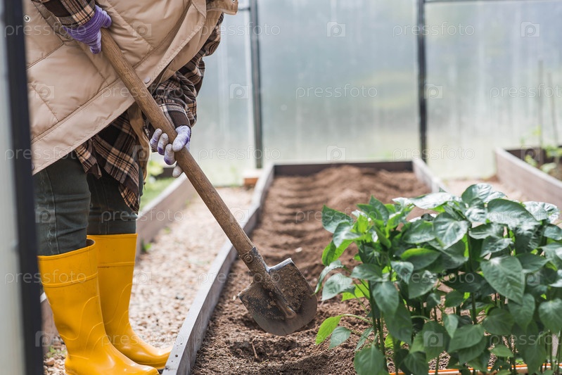 Пожилая женщина с лопатой готовит почву перед посадкой растения. Семена высаживают в землю в теплице. Концепция весенней посадки овощей и сельского хозяйства