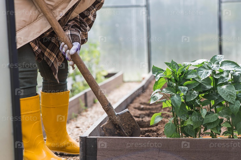 Пожилая женщина с лопатой готовит почву перед посадкой растения. Семена высаживают в землю в теплице. Концепция весенней посадки овощей и сельского хозяйства