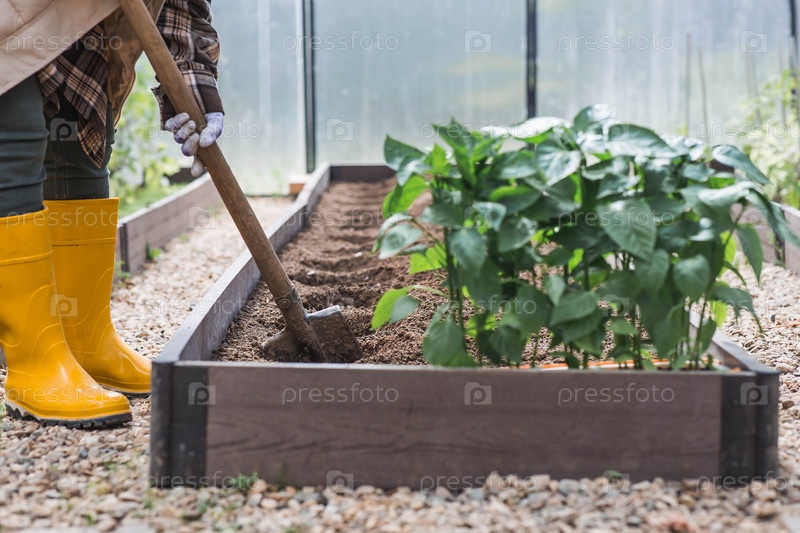 Пожилая женщина с лопатой готовит почву перед посадкой растения. Семена высаживают в землю в теплице. Концепция весенней посадки овощей и сельского хозяйства