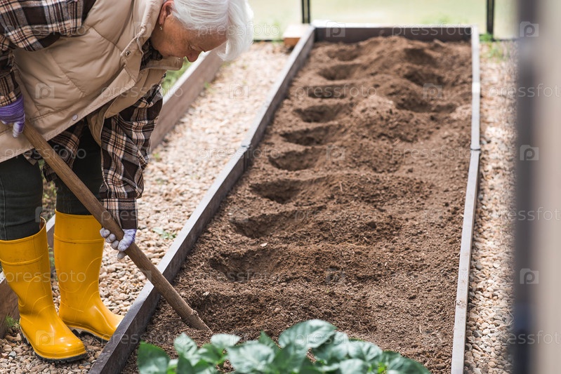 Пожилая женщина с лопатой готовит почву перед посадкой растения. Семена высаживают в землю в теплице. Концепция весенней посадки овощей и сельского хозяйства