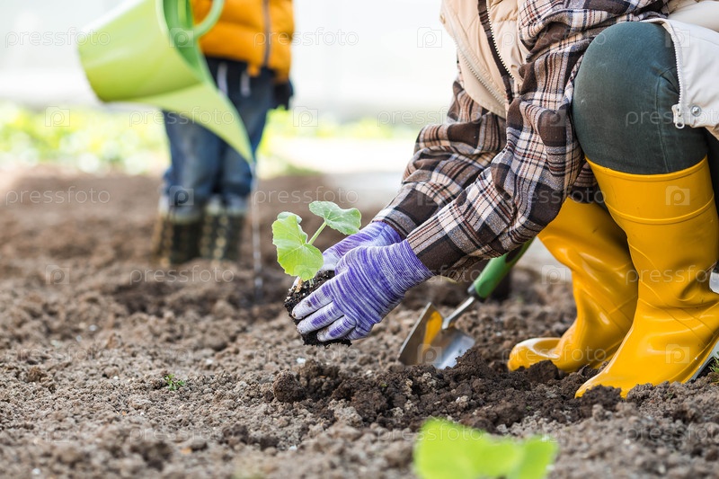 Руки женщины в садовых перчатках держат молодое растение в земле. Тыквенные и кабачковые саженцы высаживают в грунт. Концепция весенней посадки овощей и сельского хозяйства
