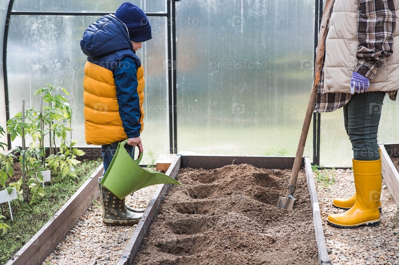 Пожилая женщина с лопатой и мальчик с поливом могут подготовить почву перед посадкой растения. Семена высаживают в землю в теплице. Посадка овощей и сельское хозяйство
