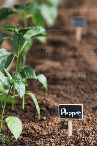 Знак с надписью Перец. Сеянцы колокольного перца высаживают в землю в теплице. Концепция весенней посадки овощей и земледелия