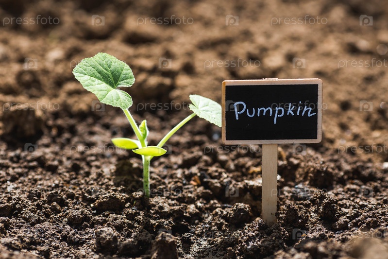 Тыквенные саженцы высаживают в землю. Концепция весенней посадки овощей и земледелия. Знак с надписью тыква
