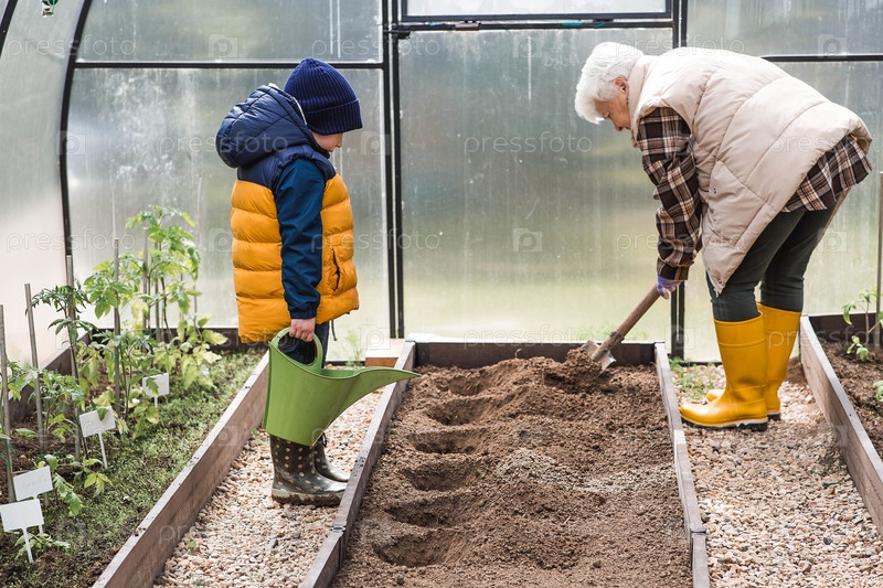 Пожилая женщина с лопатой и мальчик с поливом могут подготовить почву перед посадкой растения. Семена высаживают в землю в теплице. Посадка овощей и сельское хозяйство