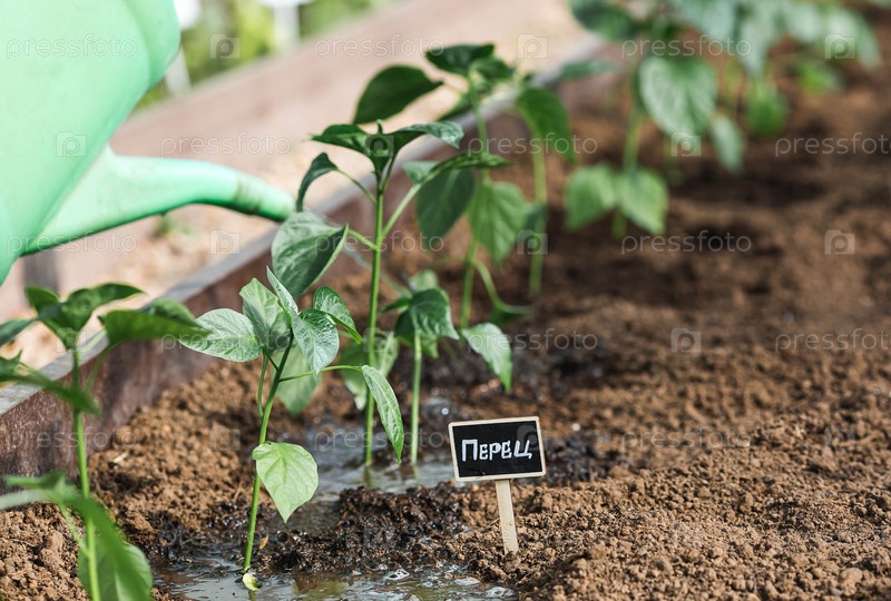 Знак с надписью на русском языке: «перец». Сеянцы колокольного перца высаживают в землю в теплице. Концепция весенней посадки овощей и земледелия