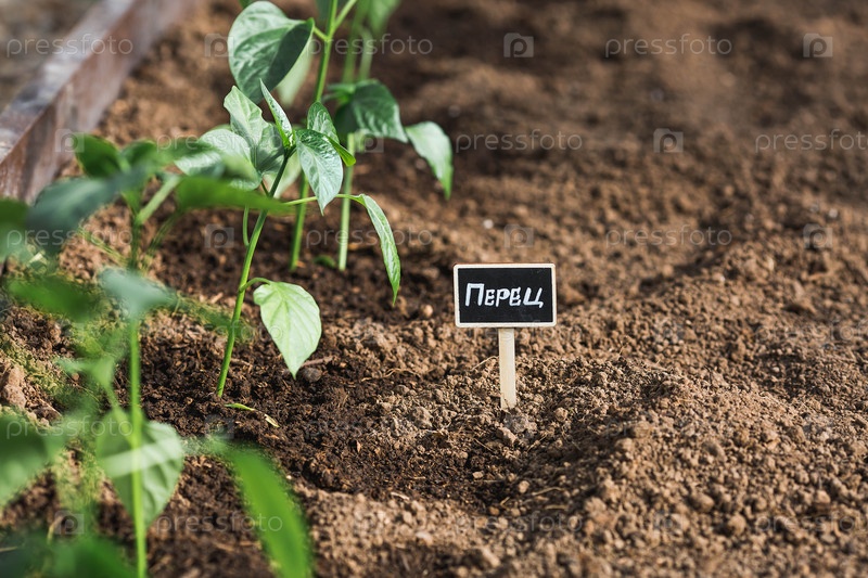 Знак с надписью на русском языке: «перец». Сеянцы колокольного перца высаживают в землю в теплице. Концепция весенней посадки овощей и земледелия
