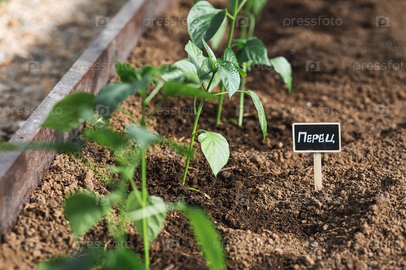 Знак с надписью на русском языке: «перец». Сеянцы колокольного перца высаживают в землю в теплице. Концепция весенней посадки овощей и земледелия