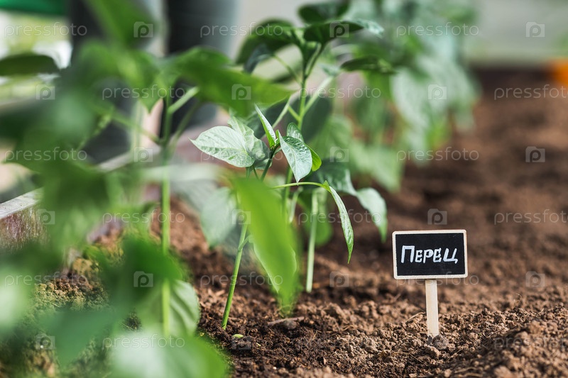 Знак с надписью на русском языке: «перец». Сеянцы колокольного перца высаживают в землю в теплице. Концепция весенней посадки овощей и земледелия