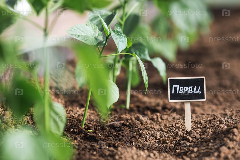 Знак с надписью на русском языке: «перец». Сеянцы колокольного перца высаживают в землю в теплице. Концепция весенней посадки овощей и земледелия