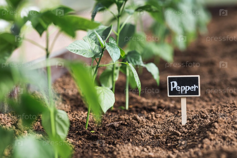 Знак с надписью Перец. Сеянцы колокольного перца высаживают в землю в теплице. Концепция весенней посадки овощей и земледелия