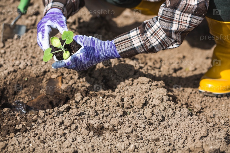 Руки женщины в садовых перчатках держат молодое растение в земле. Тыквенные и кабачковые саженцы высаживают в грунт. Концепция весенней посадки овощей и сельского хозяйства