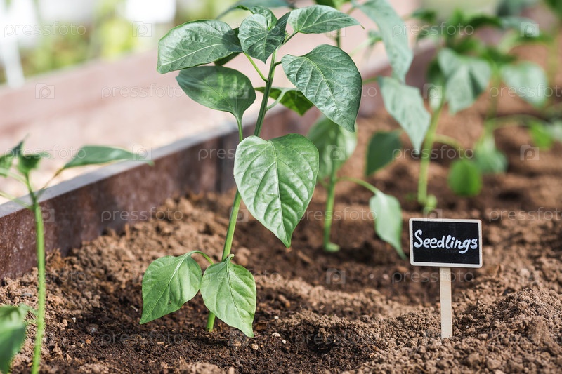 Знак с надписью саженцы. Перец Белл высаживается в землю в теплице. Концепция весенней посадки овощей и земледелия