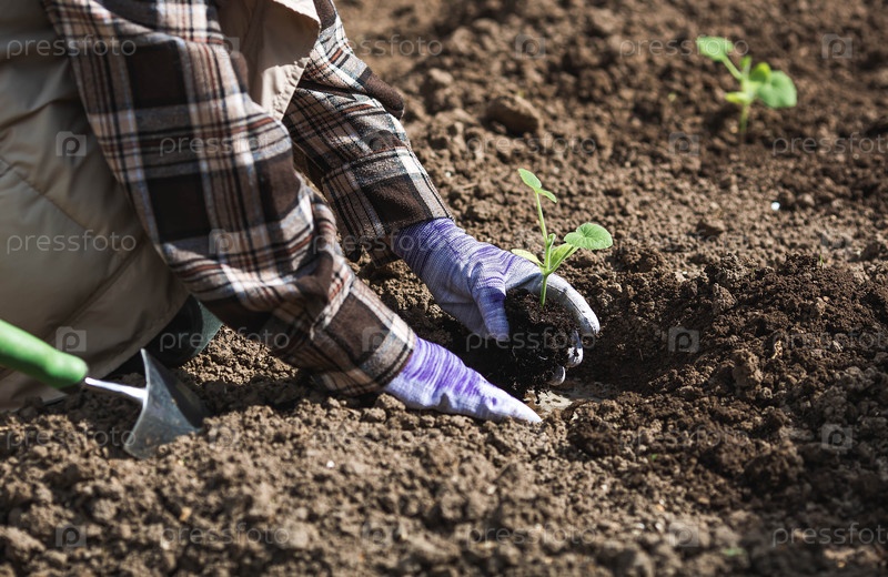 Руки женщины в садовых перчатках держат молодое растение в земле. Тыквенные и кабачковые саженцы высаживают в грунт. Концепция весенней посадки овощей и сельского хозяйства