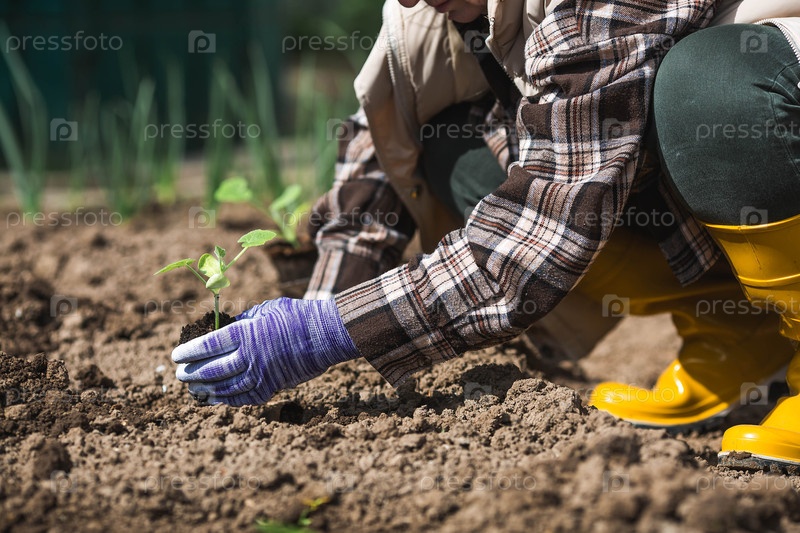 Руки женщины в садовых перчатках держат молодое растение в земле. Тыквенные и кабачковые саженцы высаживают в грунт. Концепция весенней посадки овощей и сельского хозяйства