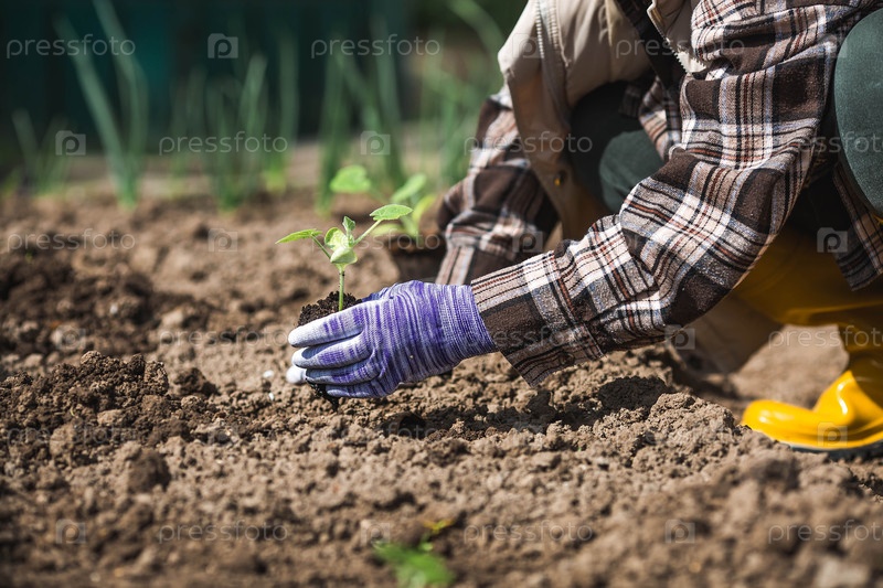 Руки женщины в садовых перчатках держат молодое растение в земле. Тыквенные и кабачковые саженцы высаживают в грунт. Концепция весенней посадки овощей и сельского хозяйства