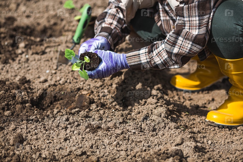 Руки женщины в садовых перчатках держат молодое растение в земле. Тыквенные и кабачковые саженцы высаживают в грунт. Концепция весенней посадки овощей и сельского хозяйства