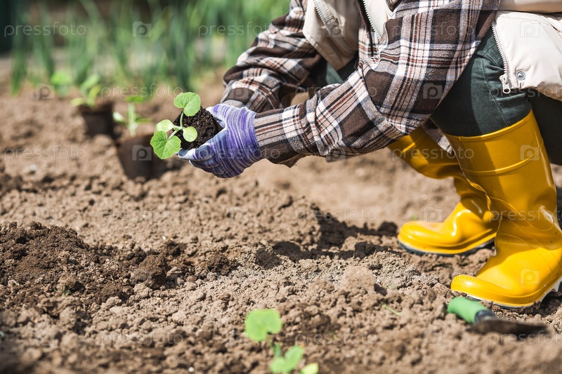 Руки женщины в садовых перчатках держат молодое растение в земле. Тыквенные и кабачковые саженцы высаживают в грунт. Концепция весенней посадки овощей и сельского хозяйства