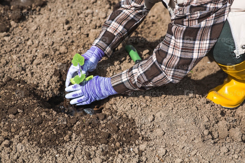 Руки женщины в садовых перчатках держат молодое растение в земле. Тыквенные и кабачковые саженцы высаживают в грунт. Концепция весенней посадки овощей и сельского хозяйства