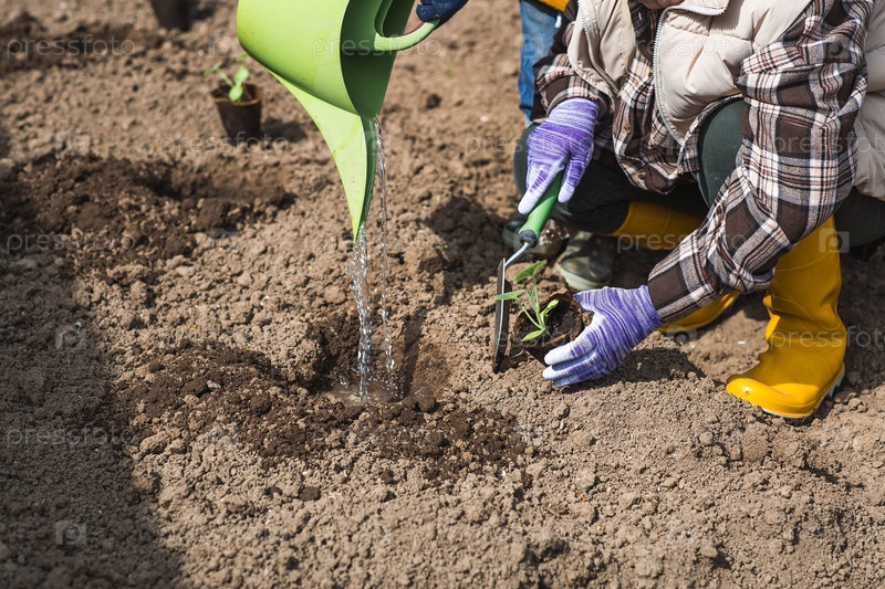 Руки женщины в садовых перчатках держат молодое растение в земле. Тыквенные и кабачковые саженцы высаживают в грунт. Концепция весенней посадки овощей и сельского хозяйства