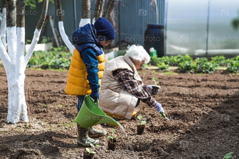Пожилая женщина и маленький мальчик сажают овощи в саду. Тыквенные и кабачковые саженцы высаживают в грунт. Концепция весенней посадки овощей и сельского хозяйства