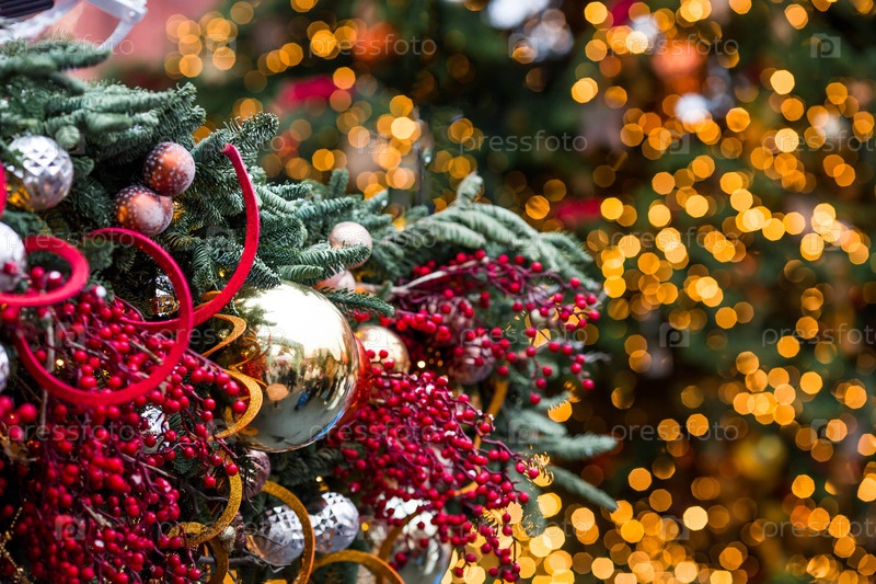 Праздничные игрушки на елке в Москве. Прекрасный рождественский фон. Концепция подготовки и декорирования к новому году. Новогодняя открытка 2026