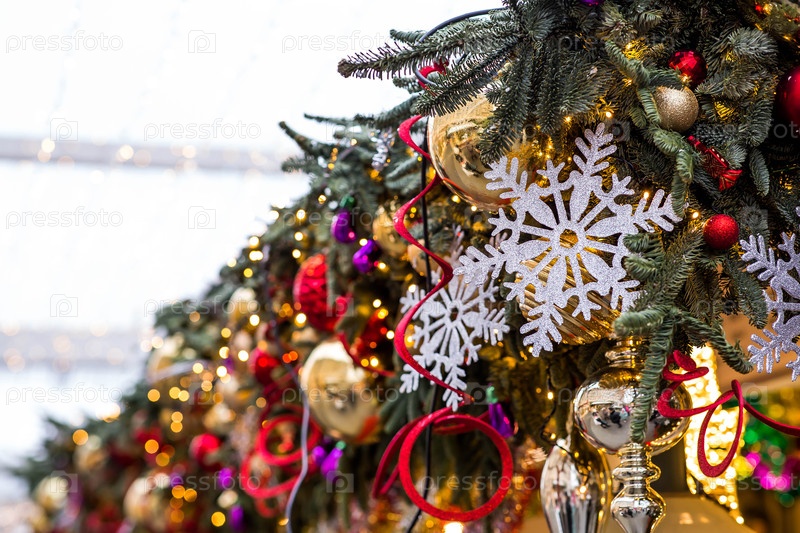 Праздничные игрушки на елке в Москве. Прекрасный рождественский фон. Концепция подготовки и декорирования к новому году. Новогодняя открытка 2026