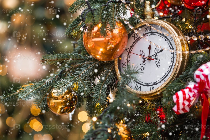 Часы на рождественской елке показывают Новый год. Руки часов показывают 12 часов ночью. Прекрасный фон для Нового года или Рождества 2026 года