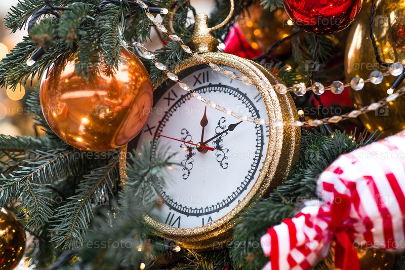 Часы на рождественской елке показывают Новый год. Руки часов показывают 12 часов ночью. Прекрасный фон для Нового года или Рождества 2026 года